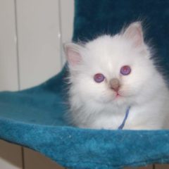 Unique est ce splendide chat de par sa fourrure soyeuse, sa queue en panache, les gants blancs qui ornent ses pattes et surtout ses magnifiques yeux saphir.